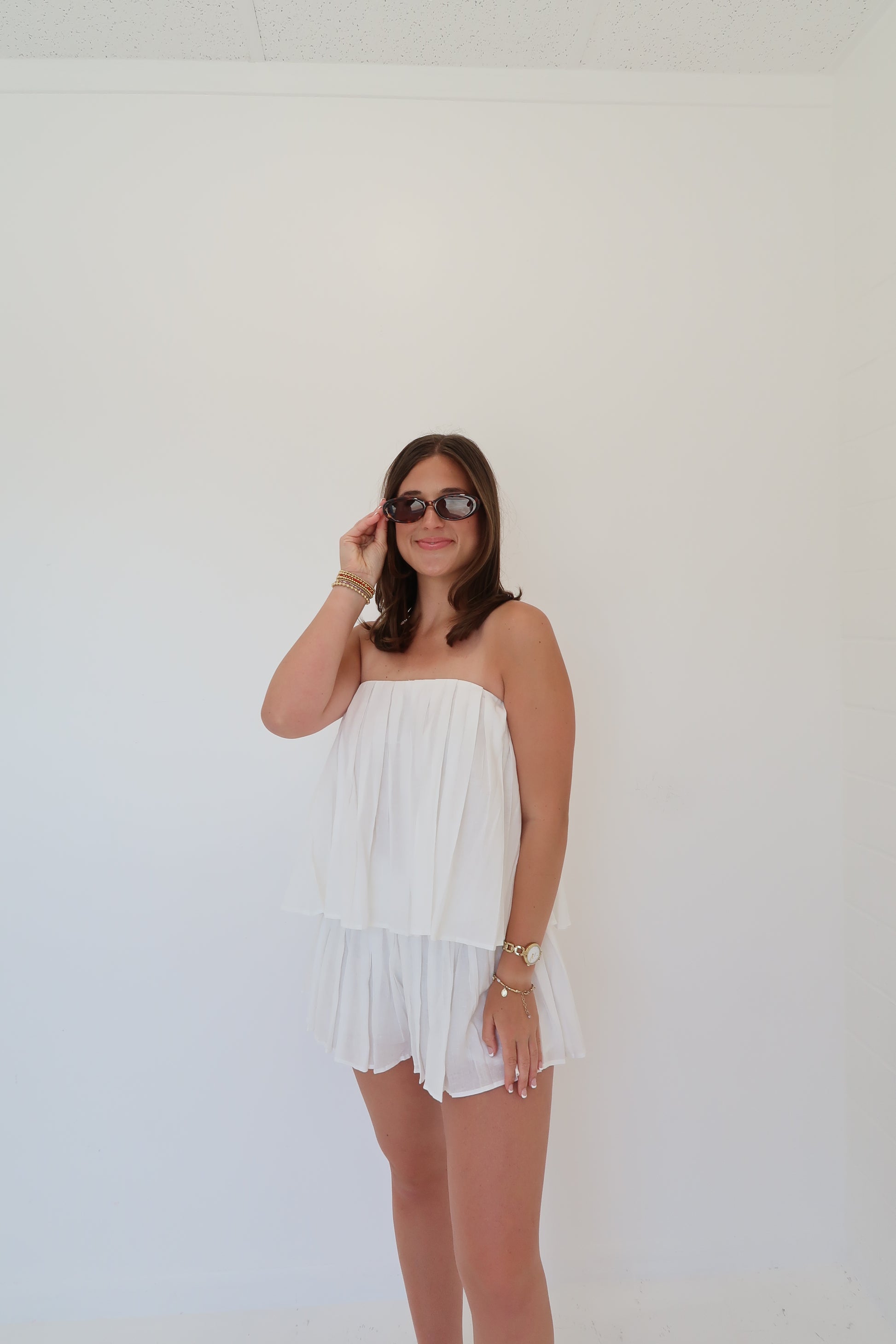This linen strapless pleated tube top and matching short set is an absolute dream outfit for spring and summer! You will feel so elegant, girly and so so classy when you wear this! The shorts have an invisible zipper on the inside as well as lining for coverage!